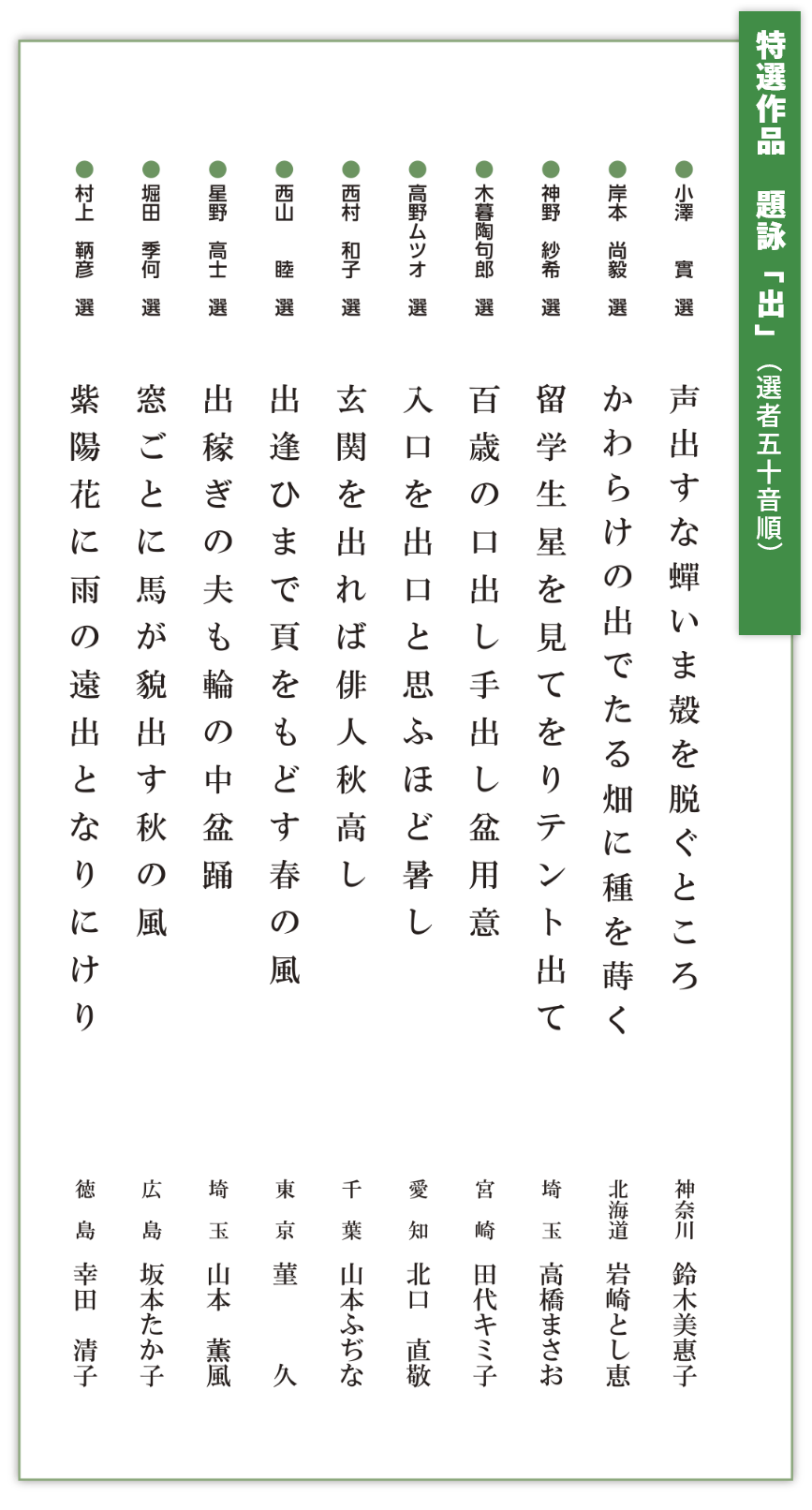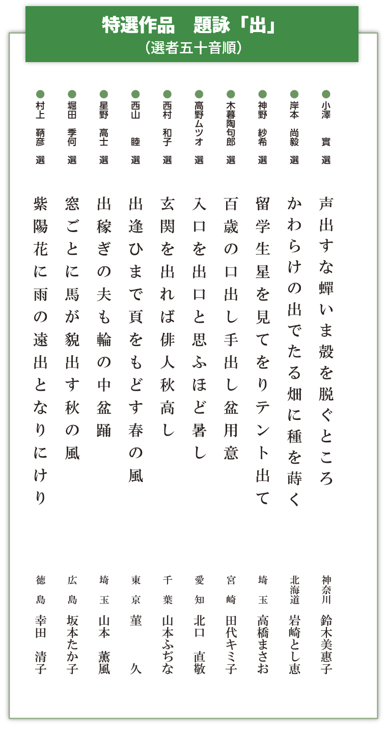 - ◆ 特選作品(題詠「出」)披講と選評