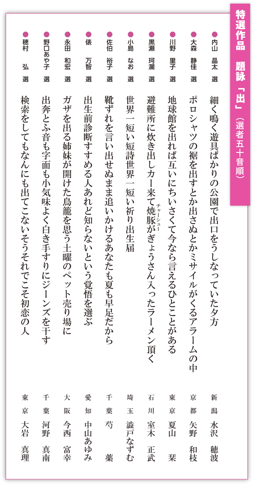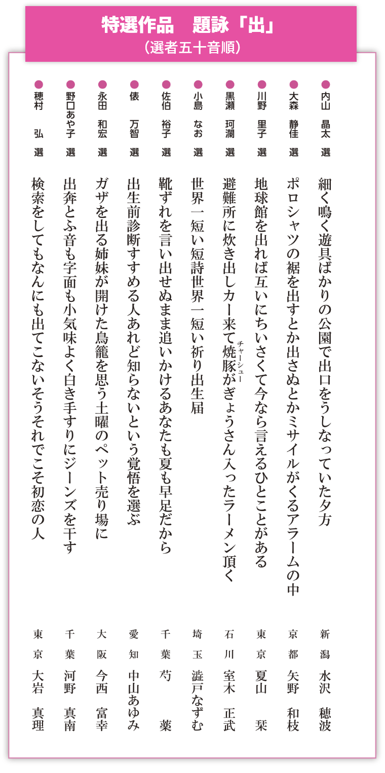 - ◆ 特選作品(題詠「出」)朗読と選評